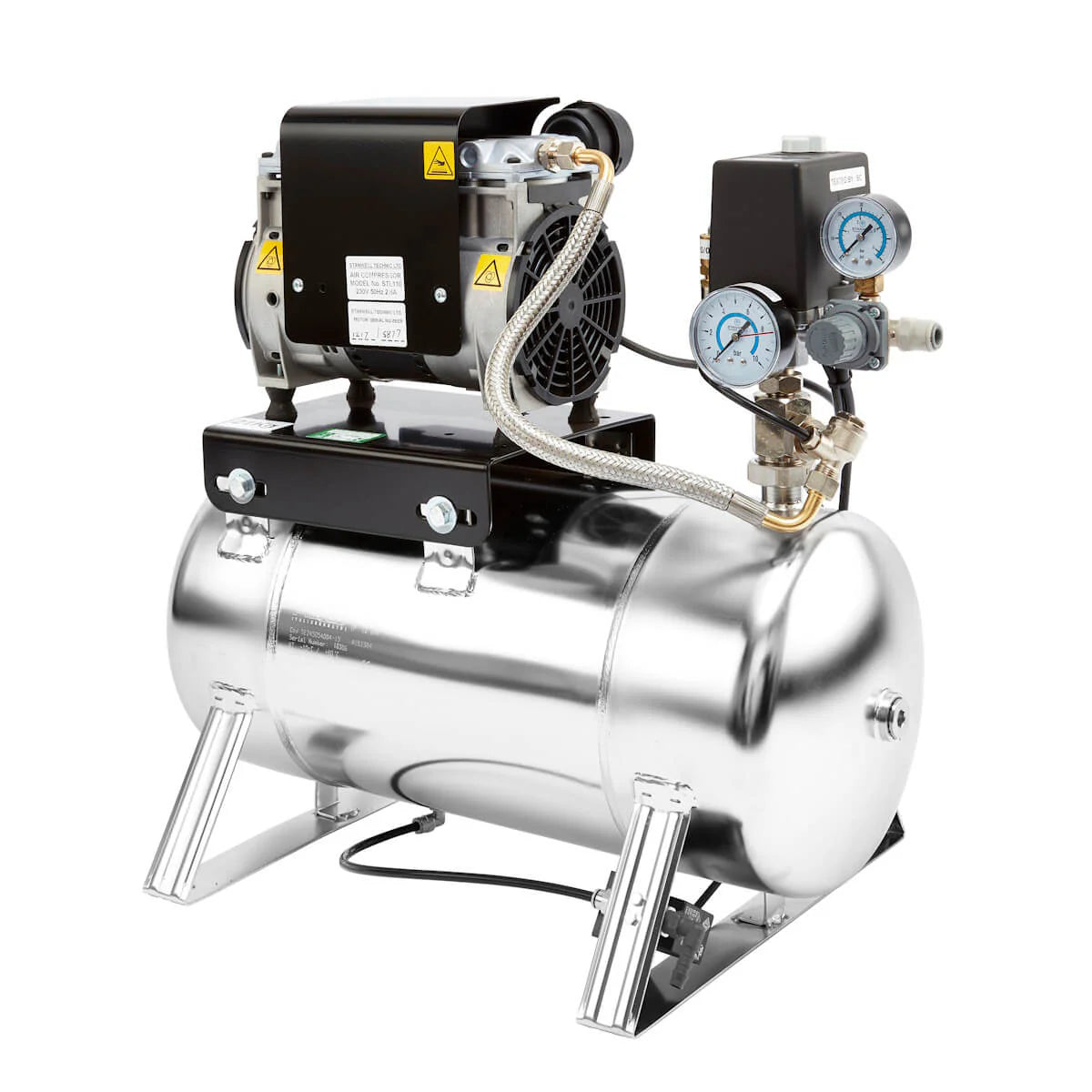 The STL 110 Oil-Free Air Compressor is a compact, high-performance solution designed for hygienic, maintenance-sensitive applications across the beverage, medical, and food service industries. Built with a durable stainless steel AISI 304 receiver and engineered for oil-free operation, it delivers clean, dry air—ideal for powering up to 16 beer pumps or 20 soft drink pumps in bars, pubs, restaurants, and other high-demand environments.